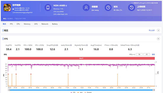 笔者进行了约33分钟左右的实际测试,在日常任务的过程中平均帧率76.2fps,从帧率表现来看,无论是NPC众多的村庄,还是野怪丛生的森林,帧率一直比较平稳,开启游戏人物学习“轻功”后在大场景、多视角的穿梭和镜头切换,出现了小幅掉帧现象。平均每10分钟卡顿次数为35.1次,平均每10分钟严重卡顿次数15.9次。