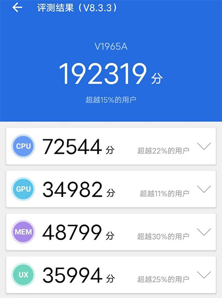 在安兔兔跑分中,获得了192319分的成绩,达到了目前千元机的主流水准。