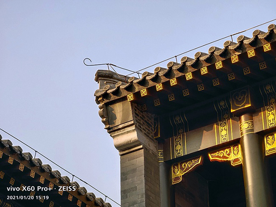 总体来说vivo X60 Pro+拍摄的画面中高光溢出控制得当,没有大范围影响画面观感,同时建筑线条、树木枝桠等细节都得到了尽可能的保留,暗部的噪点处理也很合适,控制的同时没有表现出明显的涂抹痕迹,画面整体观感非常干净。