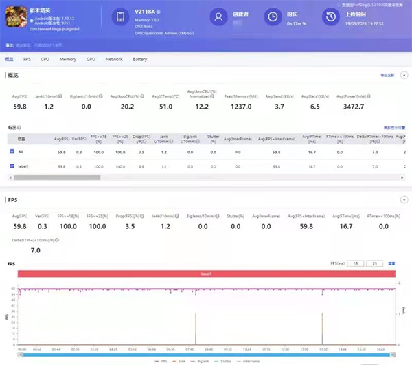 下图是使用iQOO Neo5活力版运行《和平精英》时给出的帧数数据图,平均帧数达到59.8帧,即使是全程使用高画质下进行游戏,期间也没有出现任何掉帧、卡顿现象,可以说是非常稳定。