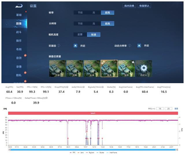 在进行《王者荣耀》游戏测试时,我们同样先开启了手机的性能模式,接着在游戏设置中分别开启了超高帧率、超高分辨率、开启抗锯齿与动态分辨率,接下来我们一起看看25分钟游戏实测的表现如何。