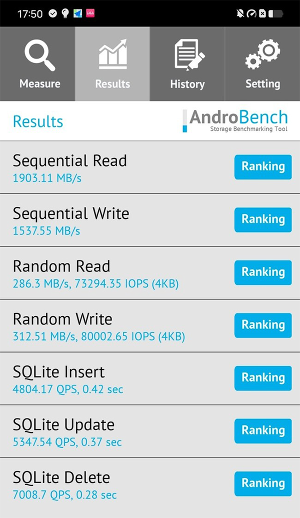 vivo S12 Pro搭载高速闪存UFS 3.1,支持双效内存融合+4G技术,可以将部分ROM拓展为RAM,同时降低系统内存开销,实现更优化的内存利用率。在AndroBench软件中,顺序读取速度1903 MB/s,写入速度为1527.55 MB/s,速度提升明显,无论是打开应用还是应用间切换,速度都会更快。