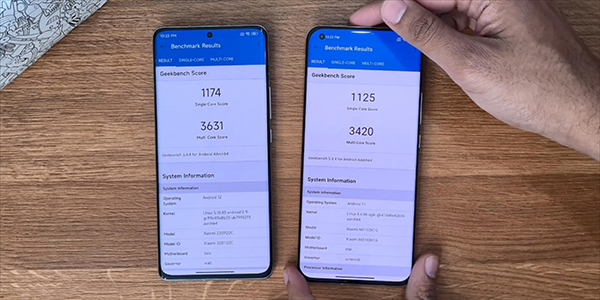 GeekBench跑分测试结果,小米12 Pro的单核跑分为1174分,多核跑分为3631分。小米11 Ultra的单核跑分为1125分,多核跑分为3420分。