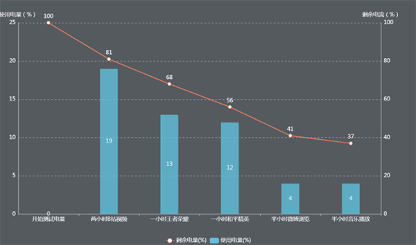 在vivo Y33s上最大的亮点,就是它所搭载的5000mAh超大容量的电池了,为了检验它的实际续航能力,我们也进行了一轮“5小时重度续航测试”,在5小时里分别进行了“两小时B站视频”、“一小时《王者荣耀》”、“一小时《和平精英》”、“半小时微博浏览”以及“半小时音乐播放”,经过实测得到的续航数据如下图所示: