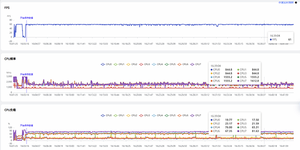由于我们在进行长时间压力测试时是选择在稻妻主城角色保持不动,所以可以看到整体的CPU频率并不高,主频仅有1.6GHz,3个大核也尽在1.55GHz;不过整体的CPU负载并不低,超大核基本维持在80%左右。
