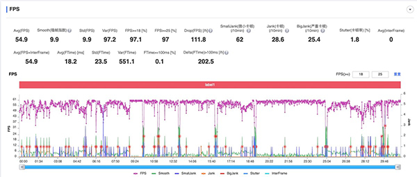 随后我们实测《原神》30分钟,将画面设置为高清画质+60帧模式。在30分钟游戏后,平均帧率为54.9帧,背部最高温度在44.3度,游戏过程中可明显感受到手机有发热现象,但在可接受范围内。