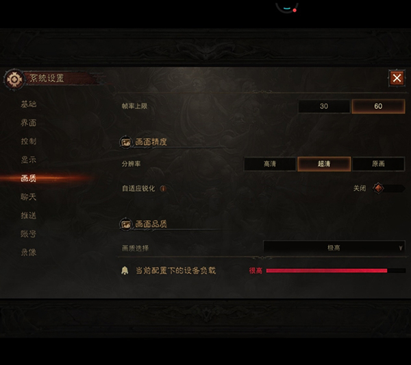 画面设定为60FPS帧率、超清分辨率、极高画质。