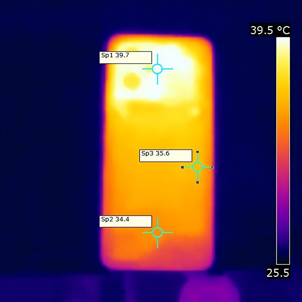 在这个散热方面,Note11T Pro+采用VC液冷+7层石墨组成的立体散热系统,其中VC面积达到2268mm²,相比上代增加32%。经过实测,Note11T Pro+在室温24℃的环境下运行高画质《原神》30分钟,机身最高温度为39.7℃,出现在摄像头附近,相比动辄40多℃的骁龙8机型表现好上很多。