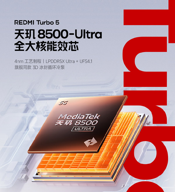 为了充分发挥这颗天玑8500处理器的潜力,REDMI也为其配备了旗舰同款的周边配置,包括LPDDR5X Ultra+UFS 4.1性能铁三角组合,3D冰封循环冷泵,以及旗舰同款狂暴引擎。