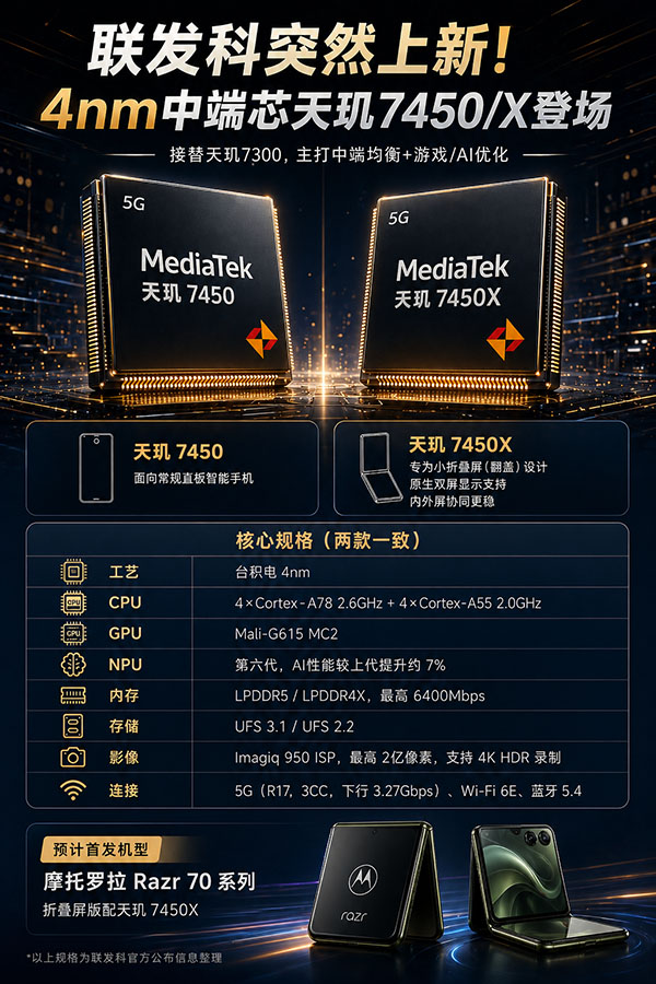 7450X,专门为小折叠做优化,双屏调度、外屏适配这些细节直接做到芯片层,说明联发科已经在提前押注折叠形态,开始做“专供型芯片”。