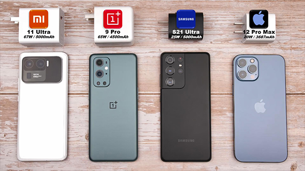 手机快充技术已经成为了手机长时间续航的有力支撑手段之一,很多国产手机厂商都喜欢把手机的快充技术进行大幅度的提升。小米11 Ultra、一加9 Pro、三星S21 Ultra、iPhone 12 Pro Max这4部手机是顶级旗舰手机,所以消费者也非常关注这4部手机的电池快充速度表现如何。