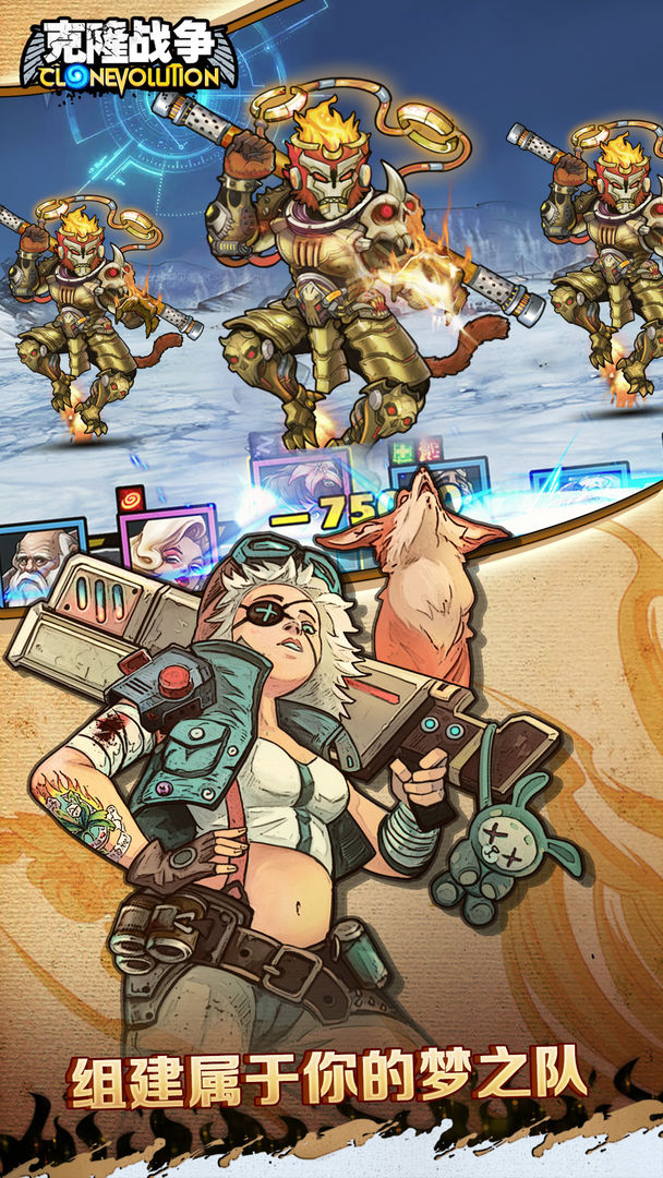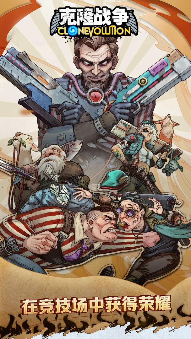 风靡海外的美式硬核卡牌游戏来啦!《克隆战争》是一款末世废土风格浓厚的卡牌游戏,搞怪的画风,酷炫的技能科技,带你进入不一样的克隆世界!在这里,你能够克隆出各种各样的历史英雄,明星大腕等等,凯撒大帝VS伊丽莎白女王,武皇帝VS德古拉,李小龙VS埃及艳后。各路英雄大乱斗!只有想不到,没有做不到,快来召唤属于你自己的克隆英雄吧!消灭邪恶的克隆生化军团!