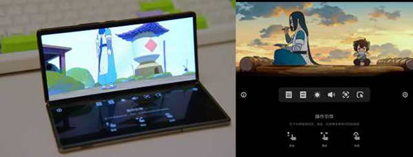 例如在用户播放时视频时,可以将手机调节进入到悬停模式,此时的vivo X Fold2手机本体会成为支架,在屏幕上对于内容进行分开显示,上半屏显示播放内容,下半屏化身操作控制板,可控制播放进度、音量以及屏幕亮度,体验非常的方便。