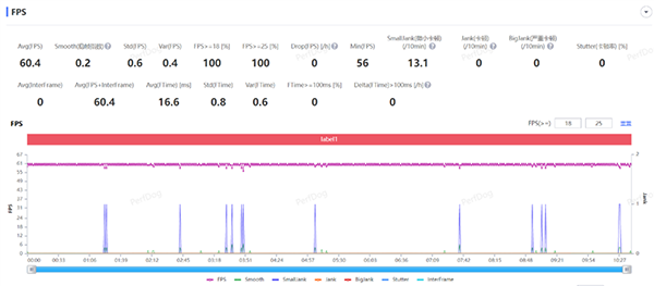王者荣耀手游,在高清画质+超高分辨率下,游戏以最高60帧运行,经过一局激烈的对战,接近10分钟的游戏,平均帧率稳定在了60.4FPS,游戏中帧率稳如一条直线,平均波动仅有0.6FPS。