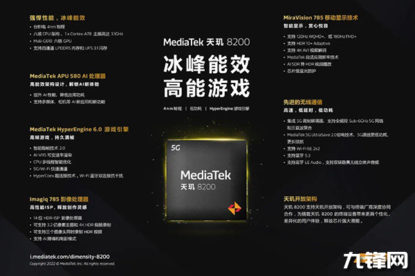 联发科天玑8200处理器,全新升级的台积电4nm制程工艺,在制程上的领先,让能耗更有优势。CPU和GPU的频率全面提升,一颗3.1GHz的A78、3颗3.0GHz的A78大核、4颗2.0GHzA55小核,GPU同样是Mali-G610。与天玑8100相比,天玑8200做了工艺升级,CPU频率有所提升,同时集成Mali-G610 GPU和APU 580,能效分别提升8%和13%。天玑8200支持最高180Hz的FHD+分辨率显示屏和最高120Hz的WQHD显示屏。