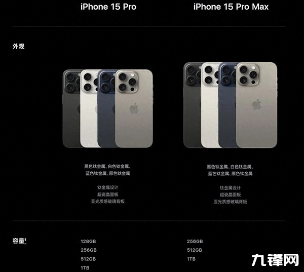 iPhone 15 Pro共有四个存储版本,分别为:128GB版、256GB版、512GB版、1TB版;