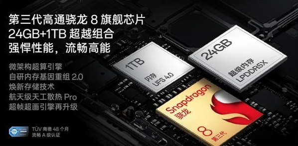 与这颗芯片搭配的,是满血版LPDDR5X+UFS4.0的内存组合。秉承着“旗舰淘汰8GB内存”的理念,本次一加12也是顶着成本上涨的压力,提供了全系12GB起步的配置,还有至高24GB+1TB的豪华组合,也成为现在市面上唯一一款24GB+1TB的第三代骁龙8机型。