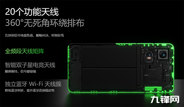 该机有20个功能天线360˚环绕机身,使得整体信号强度提升45%,还有双子星电竞天线,无论竖屏还是横屏握持,信号一样强。