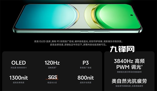 vivo Y300屏幕参数:尺寸是6.77英寸,中置打孔OLED直屏,120Hz高刷新率,分辨率率是2392x1080(属于是1080P级别),387ppi,8bit,屏占比94.21%,屏幕比例是19.9:9,手动最高亮度是800nit,全白峰值亮度是1300nit,局部峰值亮度是1800nit,低亮度2160Hz高频PWM调光(开发者模式有3840Hz高频PWM调光开关),0.68mm加厚金刚盾玻璃盖板;