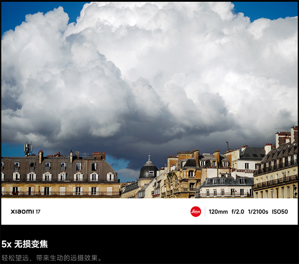 2.6倍光学变焦,5倍的无损变焦,小米17配置的是5000万像素的徕卡浮动长焦镜头,它不仅能在远景拍摄中提供2.6X光学与5X无损变焦,还能在10cm距离实现微距拍摄。
