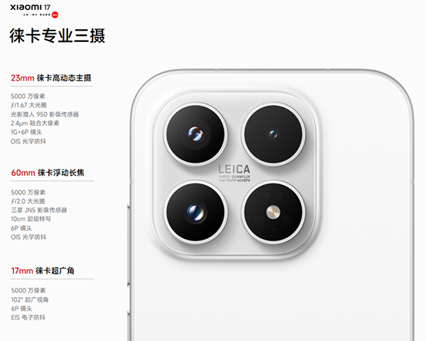 手机的拍照好不好,它与多种参数是直接关系的,除了基本的像素高低以及传感器之外,还有就是焦距了,不同的镜头配置的焦距都是不一样的,那这次的小米17相机镜头焦距是多少呢,下面带大家来看看相关的介绍吧。