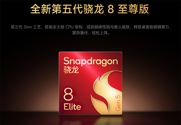 性能:首发第五代骁龙8至尊版芯片处理器(台积电第三代3nm制程N3P工艺,单核性能提升超20%,SoC整体功耗降低16%,GPU综合性能提升23%,AI性能提升37%),该机的跑分在370-390万分左右;