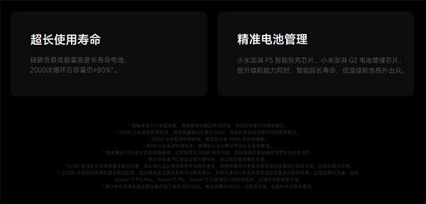 也就是说,小米17 Pro配置的是6300mAh小米金沙江电池,并且支持100W有线快充,50W无线快充。