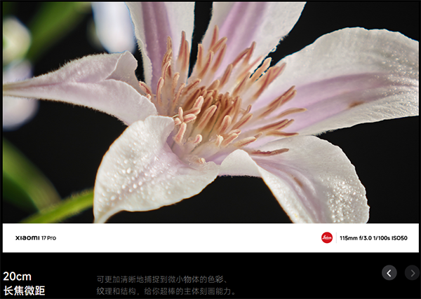 也就是说,小米17 Pro配置的是5000万像素徕卡浮动潜望长焦,并且支持20cm长焦微距拍摄,另外,超广角还带有5cm超级微距。