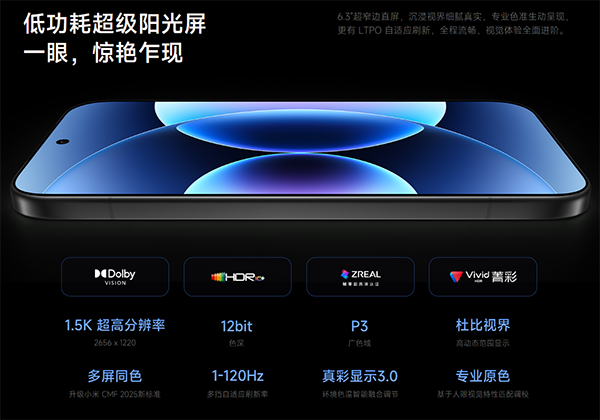 这块屏幕的分辨率为2656×1220,支持1-120Hz LTPO可变刷新率和自适应刷新率Pro,基于小米CMF 2015进行校准,默认色彩风格为专业原色,同时取消了鲜艳和高级模式选项。