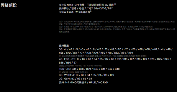 5G频段:n1/n2/n3/n5/n7/n8/n12/n13/n18/n20/n25/n26/n28/n38/n40/n41/n48/n66/n70/n71/n77/n78/n79/n80/n81/n83/n84/n89。