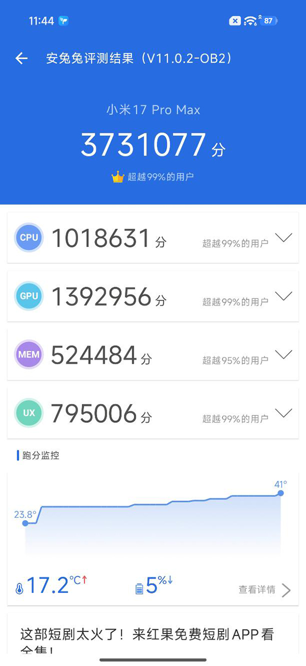 小米17 Pro Max最高成绩为3731077,其中,CPU得分1018631,GPU得分1392956;MEM得分524484;UX得分795006。