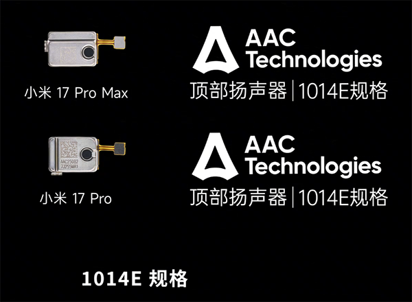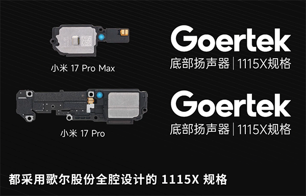 在音效方面,小米17 Pro配置的是双扬声器,顶部是瑞声科技的1014E规格+底部歌尔声学的1115X规格。