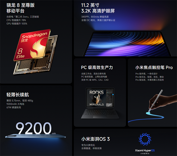 其它:红外遥控,电源键指纹识别,USB3.2 Gen1(5Gbps),蓝牙5.4,WiFi7,4个扬声器,4个麦克风,支持自适应音频,搭载HyperOS3系统,支持小米焦点触控笔Pro。