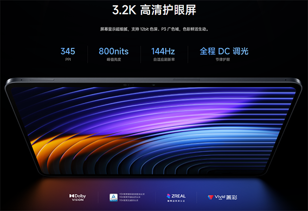 屏幕:尺寸是11.2英寸,分辨率是3200×2136,LCD屏幕,支持144Hz刷新率,全屏最高亮度800nit,345PPI,全局DC调光,手指触控采样率最高360Hz,瞬时触控采样率最高1080Hz,触控笔触控采样率240Hz,支持HDR10,杜比视界,HDRVivid,屏幕比例3:2,12bit色深,DCI-P3;