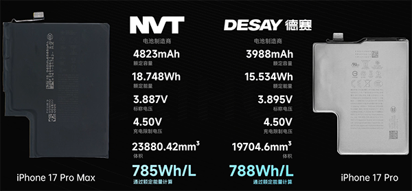 单电芯,苹果iPhone 17 Pro电池池容量为3988mAh,能量密度是788Wh/L,并且是单电芯单接口设计。