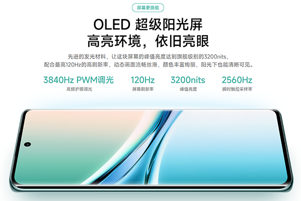 屏幕:尺寸是6.77英寸,OLED居中打孔曲屏,2392×1080分辨率,120Hz屏幕刷新率,240Hz触控采样率(2560Hz瞬时触控采样率),3200nits峰值亮度,3840Hz高频PWM调光(80nits以下)+DC调光(80nits以上),12bit色深(687亿色),DCI-P3 色域,屏下短焦指纹识别,节律护眼TÜV莱茵三重护眼认证,湿手油手触控;
