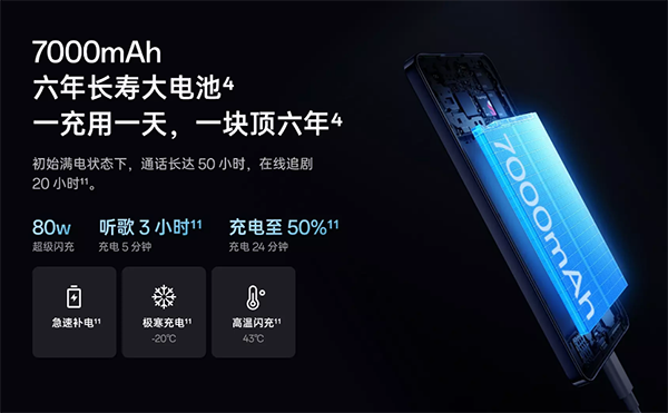 续航方面,OPPO A6 GT内置7000mAh电池,初始满电状态下,可通话50小时或在线追剧20小时,配备80W的充电功率,充电至50%仅需24分钟。