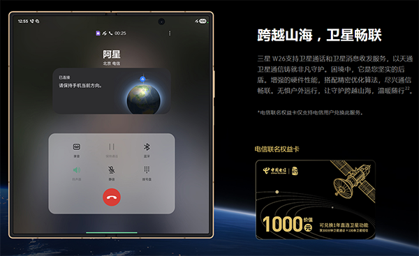 也就是说,三星W26是首款支持天通卫星通信的心系天下手机,支持双向卫星通话和卫星短信,在极端情况下提供多一种沟通保障,购机可获赠1000元天通卫星套餐权益,享1年300分钟卫星通话和100条卫星短信。该机还融入了中国电信的星小辰终端智能体AI系统。