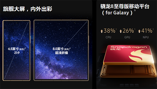 屏幕配置,8.2英寸内屏采用屏下摄像头技术,实现无开孔真全面屏,2208×1768分辨率搭配120Hz LTPO自适应刷新率,外屏6.5英寸,峰值亮度2600尼特,户外可视性领先。