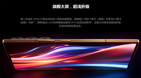 内屏采用第二代AMOLED面板,峰值亮度达2600尼特,覆盖UTG超薄玻璃。