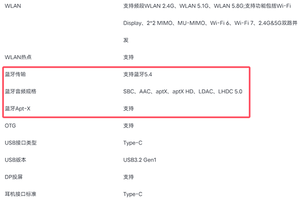 蓝牙5.4,并且支持SBC、AAC、aptX、aptX HD、LDAC、LHDC 5.0这些协议规格。