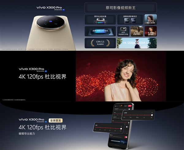 安卓首发4K 120fps双路EIS防抖、首发4K 60fps电影人像视频、首发本地AI定制美颜(端侧训练+推理)、首发烟花人像、首发动图AI路人消除。