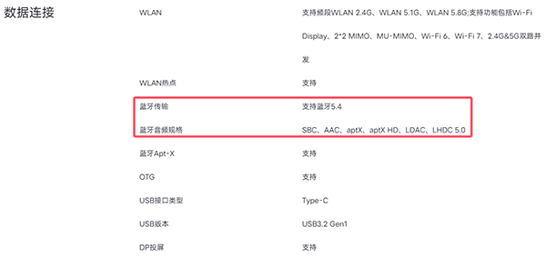 蓝牙方面,该机配置的是蓝牙5.4,并且支持SBC、AAC、aptX、aptX HD、LDAC、LHDC 5.0这些协议。