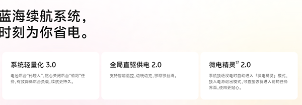蓝海续航系统通过智能优化算法,在保证手机性能的同时,有效降低了功耗,真正做到了省电不省用户体验。