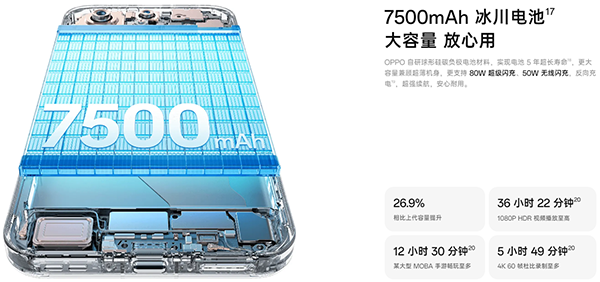 再加上OPPO自研的还针对性地开发了独家的硅负极算法,电池寿命提升60%,不但续航长,电池还能用的更久。