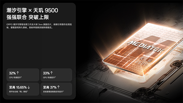 也就是说,OPPO Find X9 Pro搭载的是天玑9500处理器,并且内置有潮汐引擎,另外还有山海通信增强芯片,OPPO自研P3显示芯片。