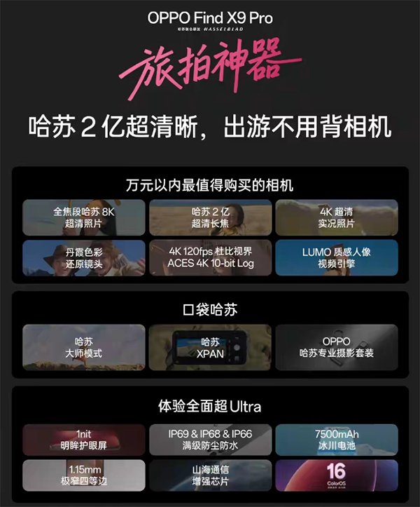 其它:有红外️和NFC,0816增强版X轴线性马达,双扬声器️(顶部是瑞声科技1012H规格,底部是瑞声科技1510规格),Wi-Fi7(802.11be),蓝牙6.0,IP66+IP68+IP69防尘防水,USB 3.2 Gen1(支持PD视频输出),双频GPS((L1 + L5)和4频北斗(B1I + B1C + B2a + B2b),卫星通信(卫星通信功能仅OPPO Find X9 Pro 卫星通信版支持,仅支持北斗卫星业务使用),汇顶超声波指纹识别,四麦克风,三重Wi-Fi天线系统,超耐用天穹架构,新一代山海通信,支持eSIM,搭载ColorOS 16系统。