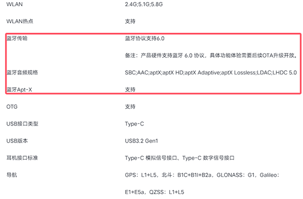 蓝牙6.0,并且支持SBC、AAC、aptX、aptX HD、aptX Adaptive、aptX Lossless、LDAC、LHDC 5.0这些规格协议。
