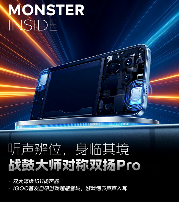 作为一款主打游戏的电竞手机,这个iQOO 15搭载了战鼓大师对称双扬Pro音响系统,并且顶部和底部都是瑞声科技的1511P规格的扬声器。