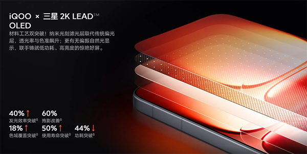 在屏幕上,这一代的iQOO 15首发搭载了一块6.85英寸2K三星珠峰屏,与三星联合研发的LEAD OLED技术直接去掉偏光层,让屏幕更亮、更通透。